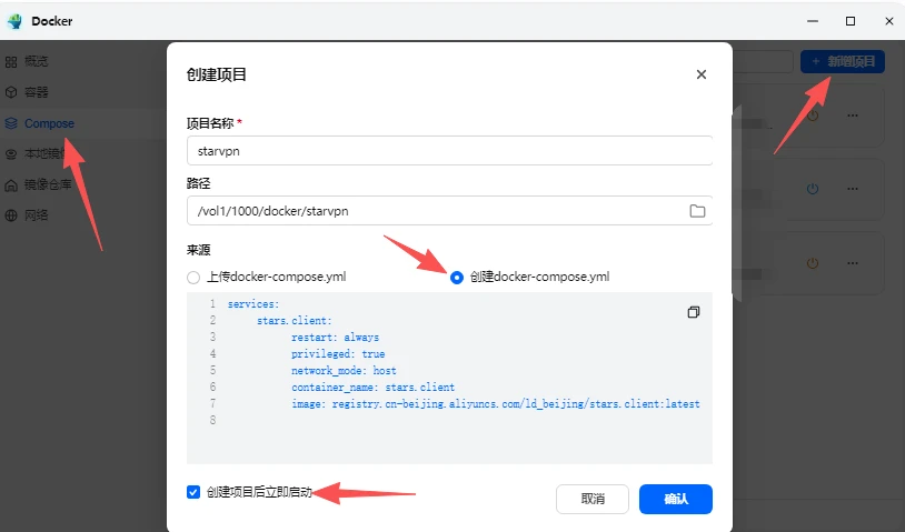 打开飞牛OS桌面的【Docker】应用,点击左侧【Compose】菜单,点击右上角的【新增项目】,在弹出的窗口中,填写项目名称【starvpn】,填写路径【此路径为第一步准备工作中创建的文件夹】,选择【创建docker compose.yml】,粘入【复制的代码①】,点击【确定】即可;