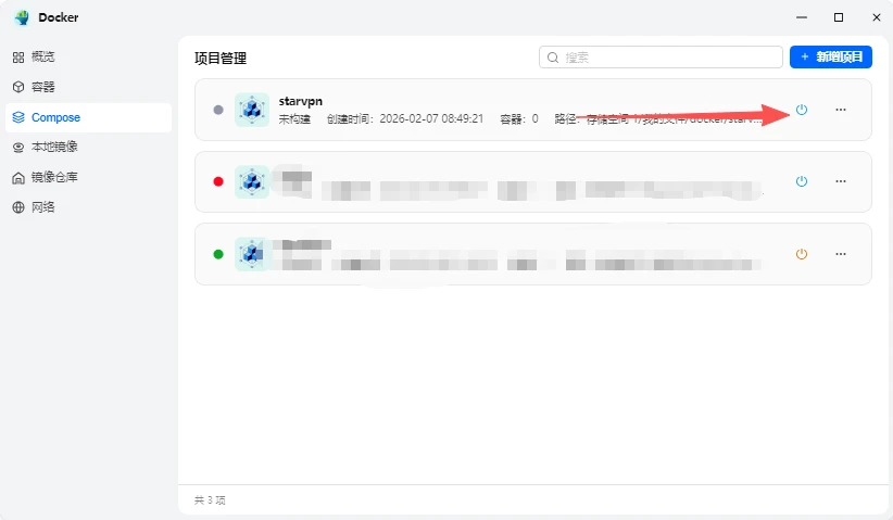 此时进入到项目管理页面,在列表点击刚才创建的【starvpn】项目右侧的启动按钮(类似电源图标),docker项目会自动下载镜像及构建;