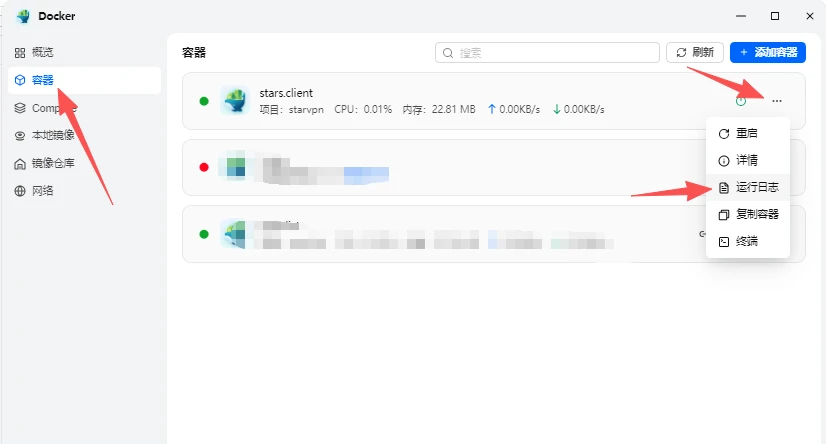 创建好了之后,点击左侧【容器】菜单,进入容器管理界面,找到【starvpn】容器【stars.client】,鼠标移到容器右侧更多(…),在弹出的菜单中,选择运行日志,点击查看;