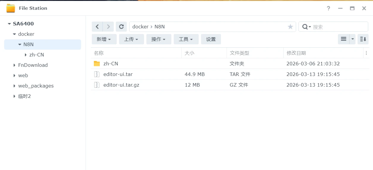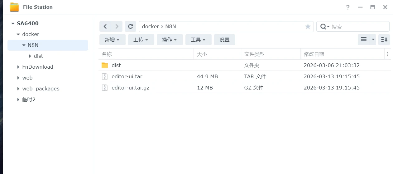 创建好后,把下载的editor-ui.tar.gz文件上传到刚刚创建的N8N文件夹里面,右键editor-ui.tar.gz文件,选择解压缩——解压缩至此目录,然后再次右键解压出来的editor-ui.tar文件,再次解压缩——解压缩至此目录,可以看到有个dist文件夹,右键重新命名为zh-CN 。