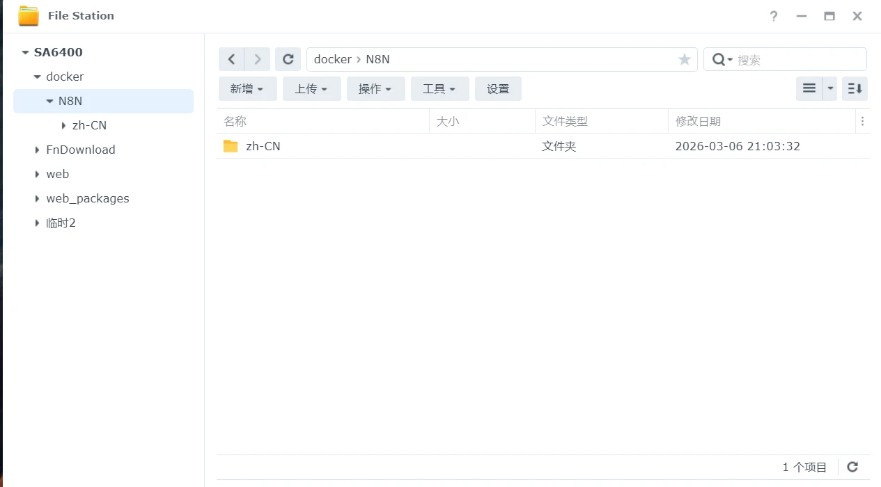 打开群晖桌面的【File Station】,点击左侧【docker】进入【docker】文件夹,点击菜单【新增】选择【新建文件夹】,文件夹名称【N8N】