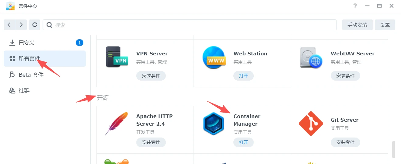 在左侧【所有套件】内的开源部分找到【Container Manager】,点击安装即可