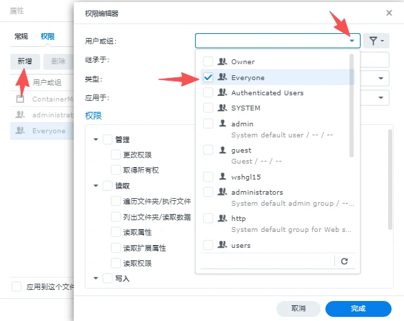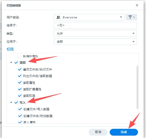 勾选读取和写入两组权限,点击完成
