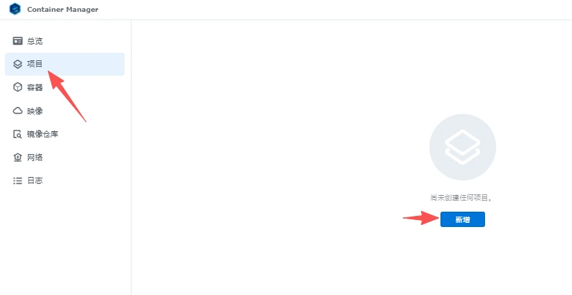 打开【Container Manager】,点击左侧项目菜单,点击新增