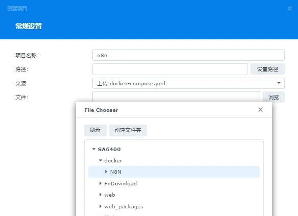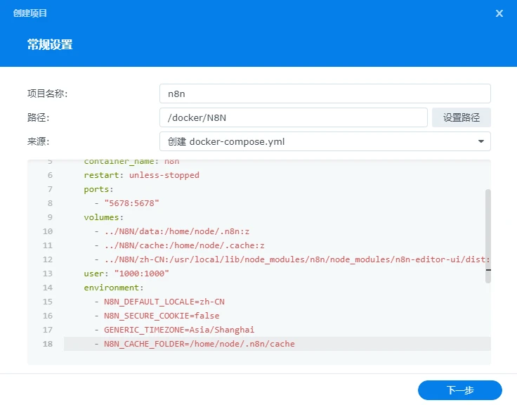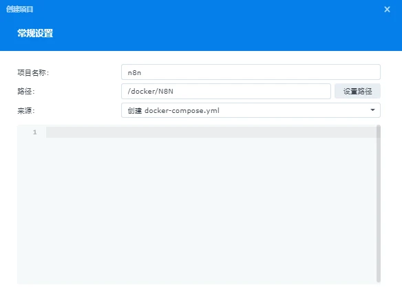 项目名称自定义,路径选择创建的N8N文件夹,选择创建docker-compose.yml