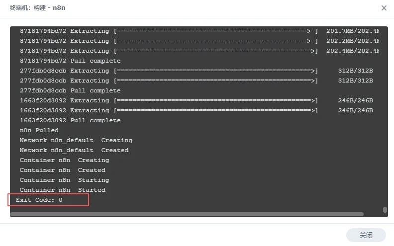 接下来会拉取映像,等待出现如下提示即拉取构建完成,点击关闭即可,等待一段时间即可访问N8N。
