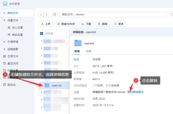 - '/etc/openlist:/opt/openlist/data' 中的 /etc/openlist 为开篇准备工作中创建文件夹的位置,即创建完成文件夹后,准备工作步骤最后复制的路径!
