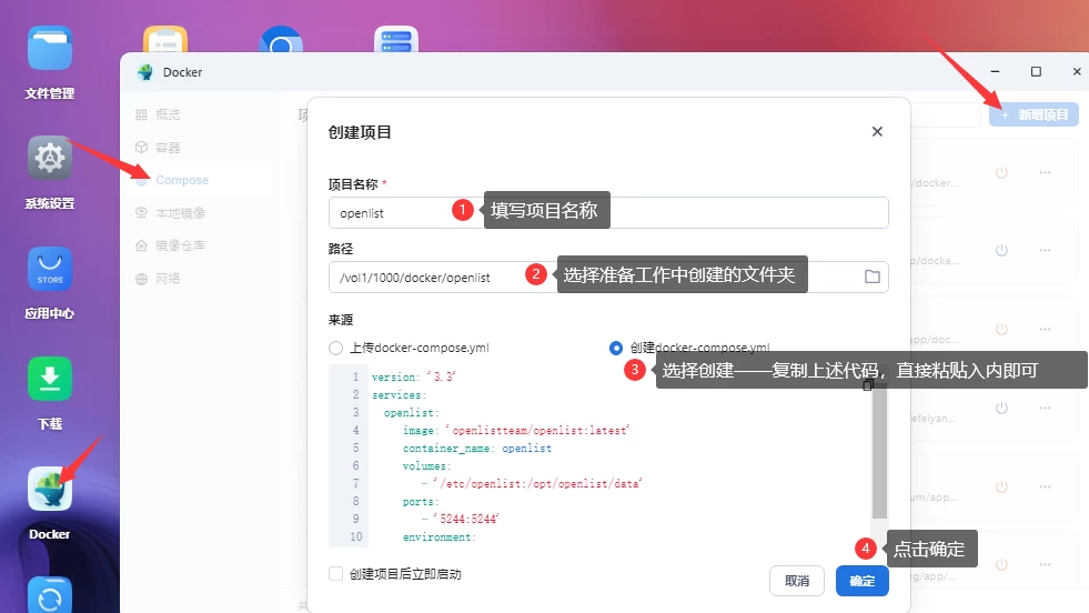 打开飞牛OS桌面的【Docker】应用,点击左侧【Compose】菜单,点击右上角的【新增项目】,在弹出的窗口中,填写项目名称【openlist】,填写路径【此路径为第一步准备工作中创建的文件夹】,选择【创建docker compose.yml】,粘入【刚才复制的代码(代码①)】,点击【确定】即可;