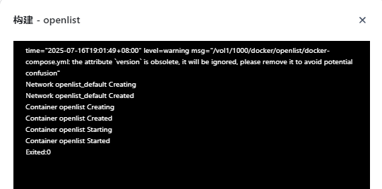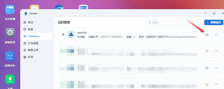 此时进入到项目管理页面,在列表点击刚才创建的【openlist】项目右侧的启动按钮(类似电源图标),docker项目会自动构建;