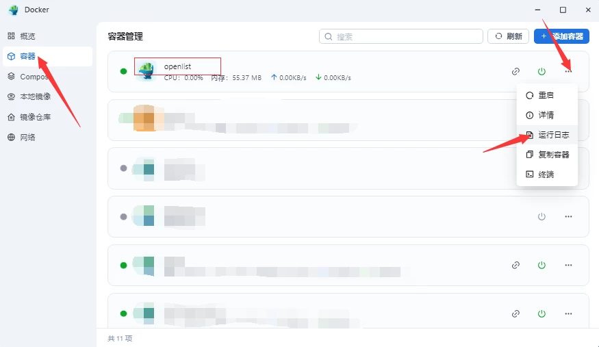 创建好了之后,点击左侧【容器】菜单,进入容器管理界面,找到openlist容器,鼠标移到容器右侧更多(…),在弹出的菜单中,选择运行日志,点击查看;