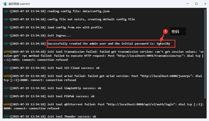 找到 Successfully created the admin user and the initial password is: EgKxvZBy 这行,其中password为密码的意思,冒号后面的即为密码,账号统一为admin;