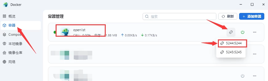 2、可在飞牛NAS的docker应用中左侧菜单中的容器,找到刚刚创建的openlist项目,鼠标移到右侧快捷访问按钮,在弹出菜单选择5244:5244,点击即可打开;