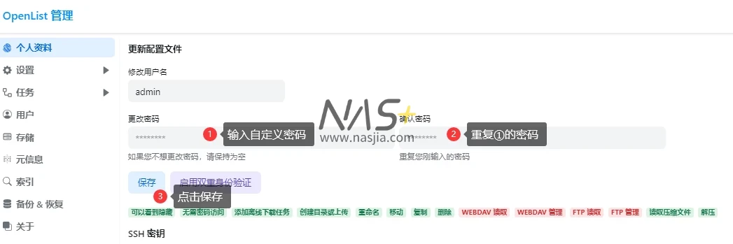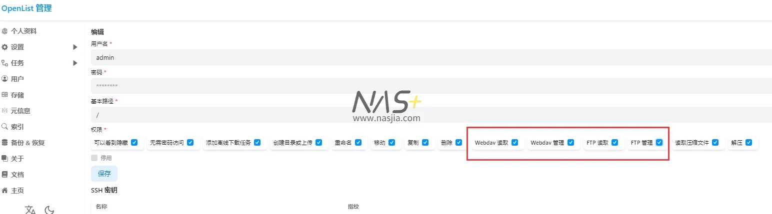 勾选红框圈选的四个权限:webdav读取、webdav管理、FTP读取、FTP管理,点击保存,会要求再次登录