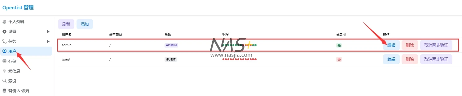 重新登陆输入账号admin,以及刚刚更改的密码,再次登录后,点击左侧的【用户】菜单,进入用户列表,点击admin用户后面的编辑按钮