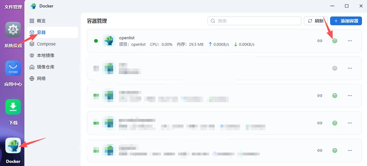 打开docker应用,点击左侧【容器】菜单,进入容器管理界面,找到openlist容器,鼠标移到容器右侧电源图标,结束容器运行;