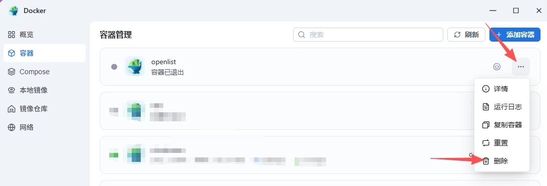 之后鼠标移到容器右侧更多(…),在弹出的菜单中,选择删除,删除此容器;
